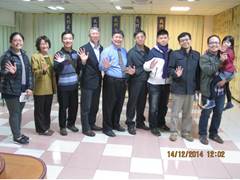 參、南部禱告會 u 11/30與岡山眾教會在岡山公園舉辦愛心福音園遊會,設置手擲飛行罐遊戲,感謝岡山志工的熱情參與並連結,收入1530元,代表加利利傳道會奉獻給大會所指定的福音機構。 u 為陸官12/13校運暨愛心社舉行義賣活動順利,並與學校師生美好互動連結感恩。 u 12/14主日探訪左營愛加倍靈糧堂李永明牧師及基督徒軍人,並連結傳遞軍中福音負擔。照片如右。 u 12/14晚參與岡山眾教會聖誕點燈活動,祝福岡山成為幸福、真愛的城市並與基督徒軍人美好連結。哈勇還是當晚的最佳主持人! u 12/27聖光神學院陳吉松院長嫁女兒,在高雄循理會婚禮、聖光神學院婚宴,為新人蒙賜福禱告。 u 12/8再訪定居在麻豆積極籌備建立教會的立仁、麗娜夫婦,為土地及地上建物的產權獲得過程順利代禱! 肆、真愛(愛心)團契 u 藉陸官12/13校運暨愛心社舉行義賣活動,連結久未來聚會之同學並留下美好互動感恩。 u 為尊仁11/13脂肪瘤手術後之康復及身心靈的壓力,求主賜聰明智慧恩典夠用。